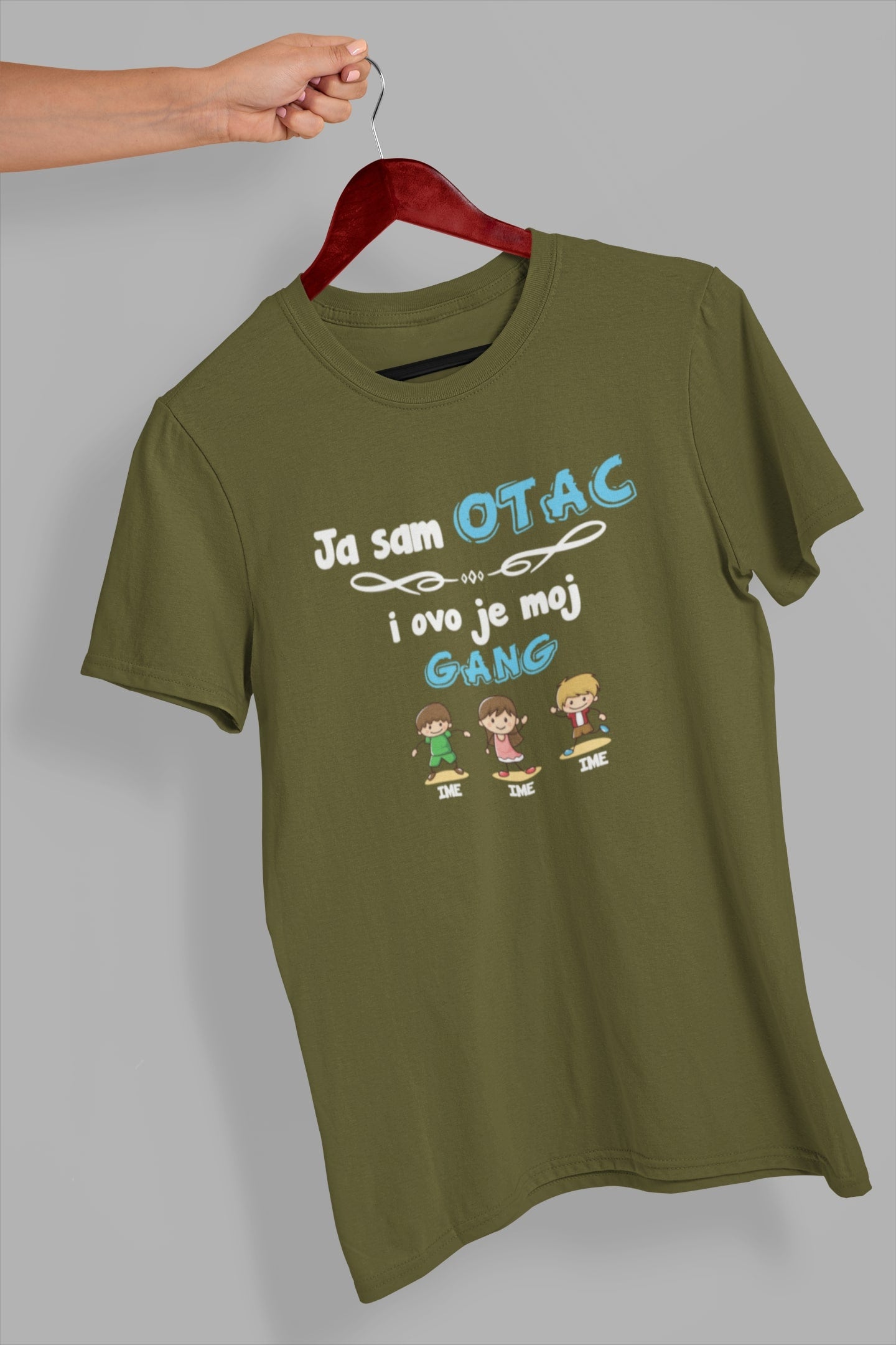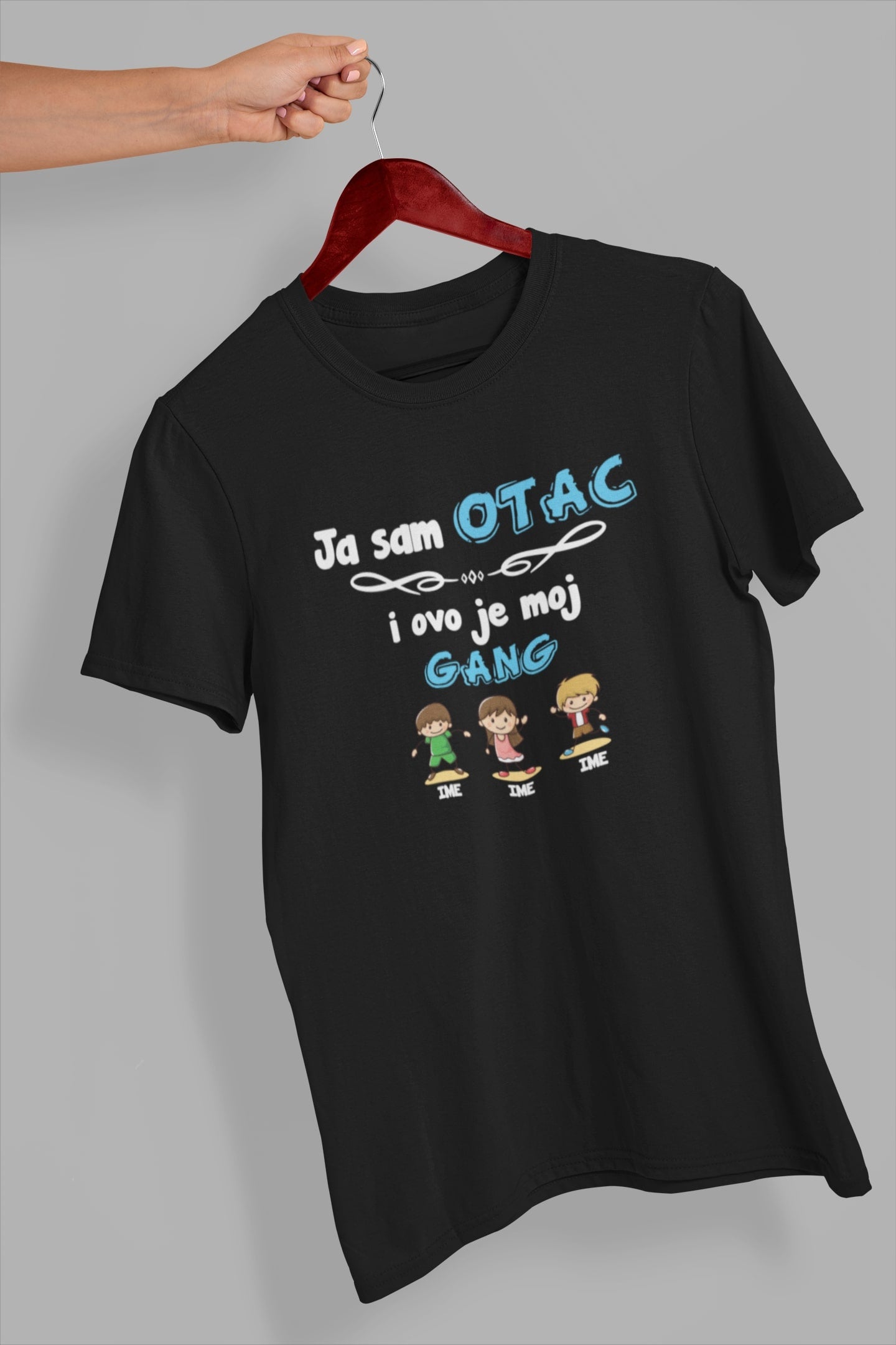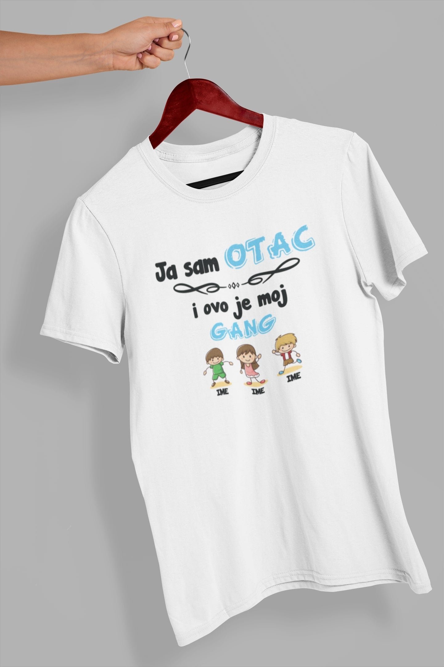 Na majici se nalazi natpis "Ja sam otac i ovo je moj gang". Ispod natpisa se nalazi ilustracija očeva uz imena. Imena očeva možete prilagoditi po vašoj želji – jednostavno ih napišite u napomenama uz proizvod prilikom narudžbe.