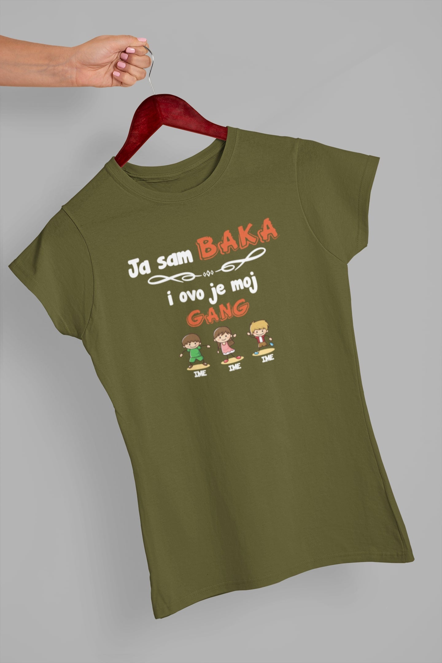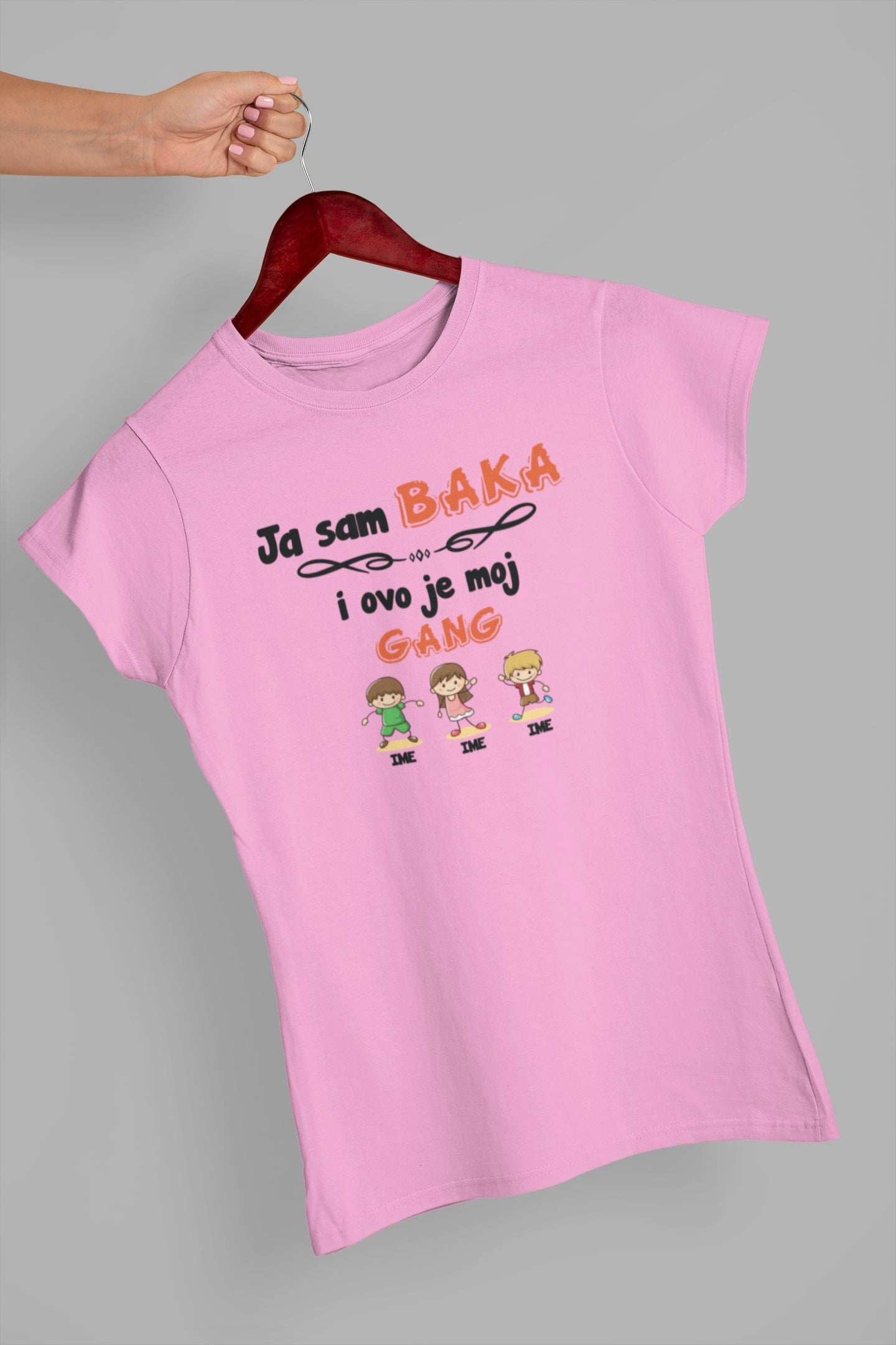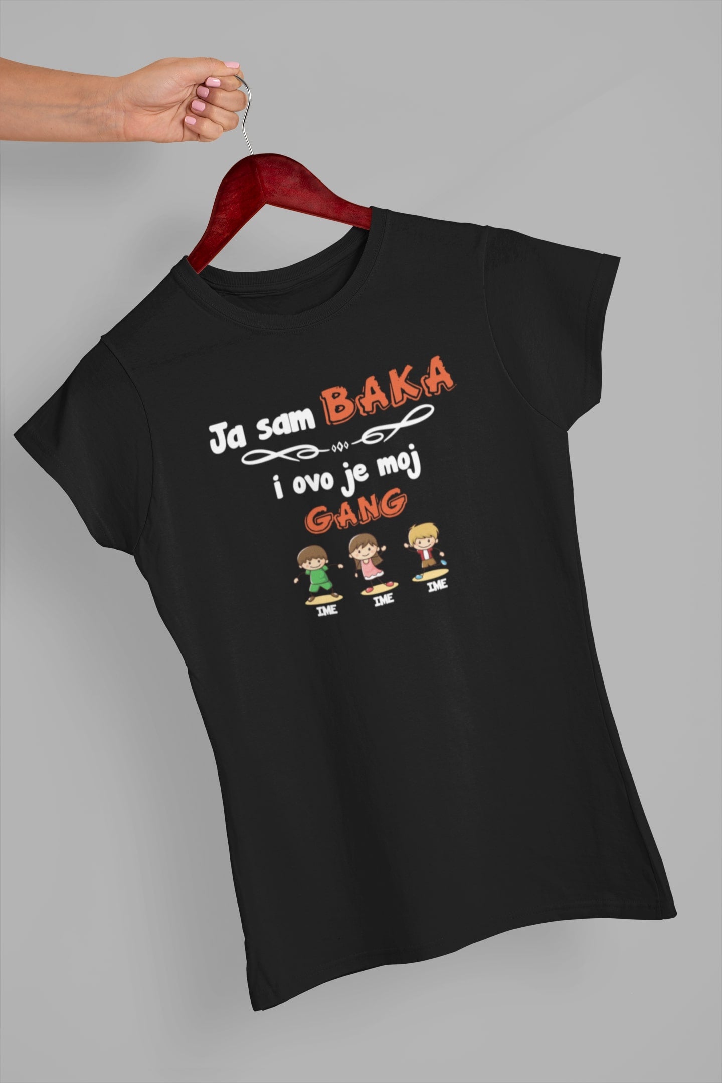 Na majici se nalazi natpis "Ja sam baka i ovo je moj gang". Ispod natpisa se nalazi ilustracija dece uz imena. Imena dece možete prilagoditi po vašoj želji – jednostavno ih napišite u napomenama uz proizvod prilikom narudžbe.