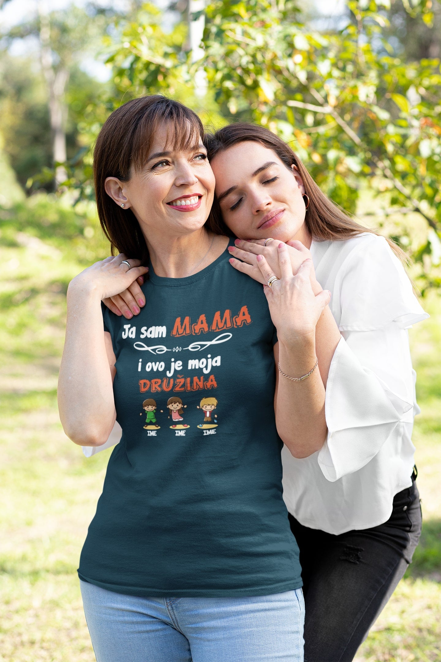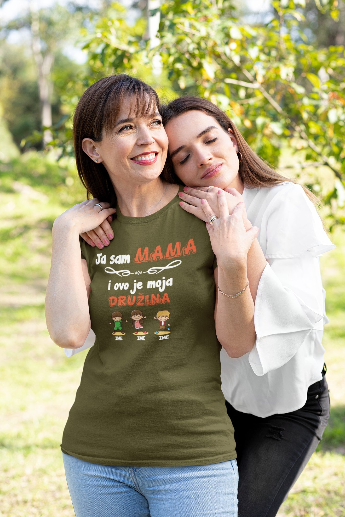 Na majici se nalazi natpis "Ja sam mama i ovo je moja družina". Ispod natpisa se nalazi ilustracija dece uz imena. Imena dece možete prilagoditi po vašoj želji – jednostavno ih napišite u napomenama uz proizvod prilikom narudžbe.